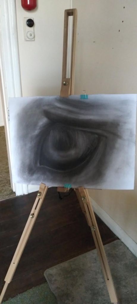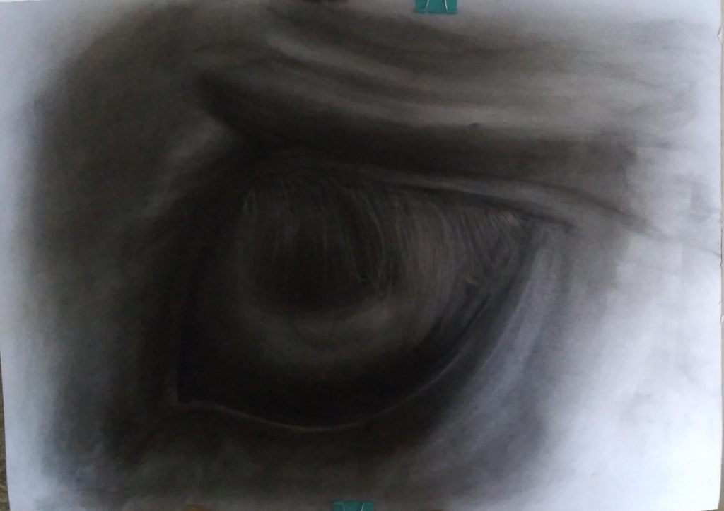 I saw on Instagram some art that captivated me… chroism_art, Yuto Otsuki. I didn’t want to replicate what he was doing, but I loved watching him draw and how he contemplated a thought before beginning. Yes! The next day, I tried to recreate the experience of the day before. Using black soft pastel I tried to draw a horses eye from a photo. Nah….I felt my attention being pulled out of my intuition and into the photo, trying to get the light and shapes ‘right’. Good learning. Draw Intuitively, so refreshing for my portrait drawings too.