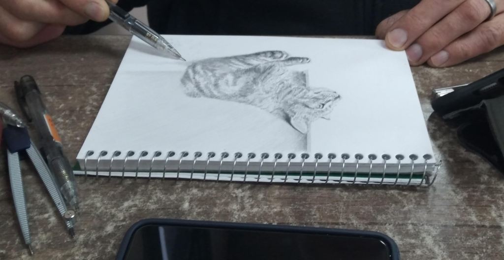 Work in progress. This is a drawing of Bruce, a kitty friend from a Sth Island housesit in September 2018. Typically ‘Cat’, cuddles were on his terms only. He found the best entertainment was playing with a leaf from a cabbage tree.