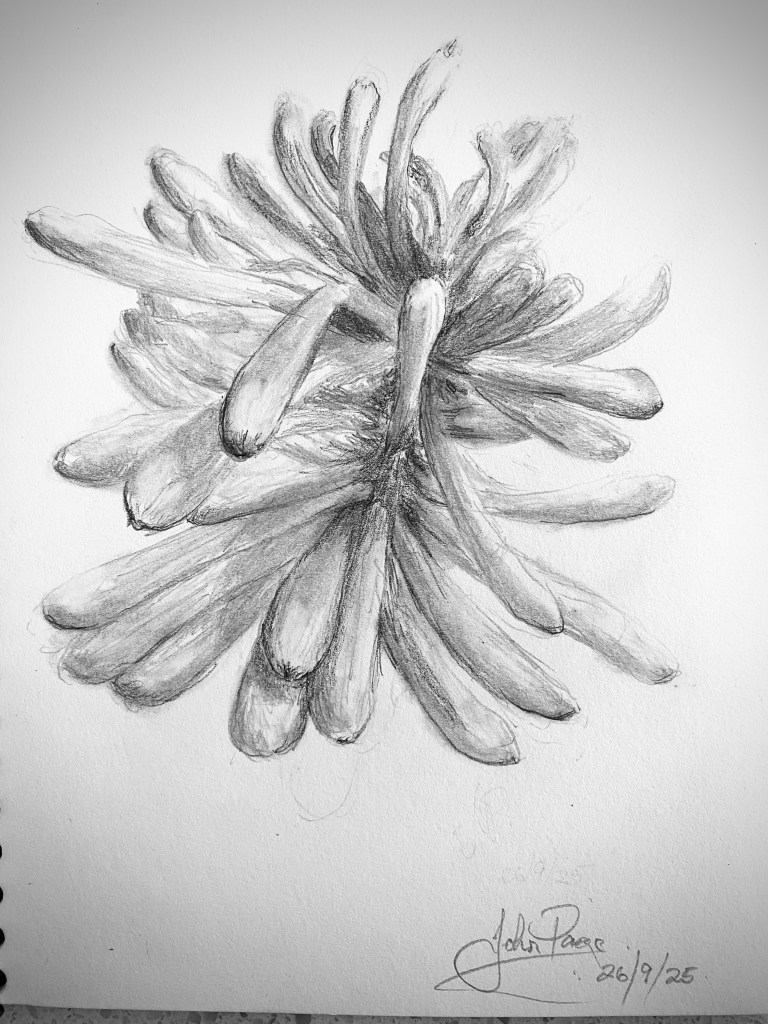 Daily doodles help develop skill and detail. This drawing was taken from a photo during a visit to Stratford, Taranaki, 2016. Red Hot Pokers bring vibrant colour to the colder months in New Zealand.