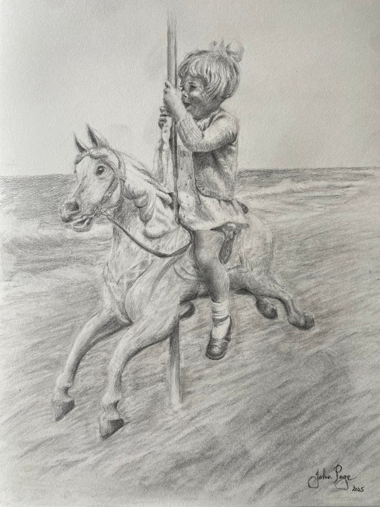 This sweet drawing by John was adapted from an old photograph of this mum as little girl, around 1938. Memories of when, as a child, your imagination could take you anywhere. And for us, it still does, through our drawings and writing. Editing the manuscript for ‘The Attic – A World Between Worlds’ is a slow process, but I am loving reading over Molly’s Story.