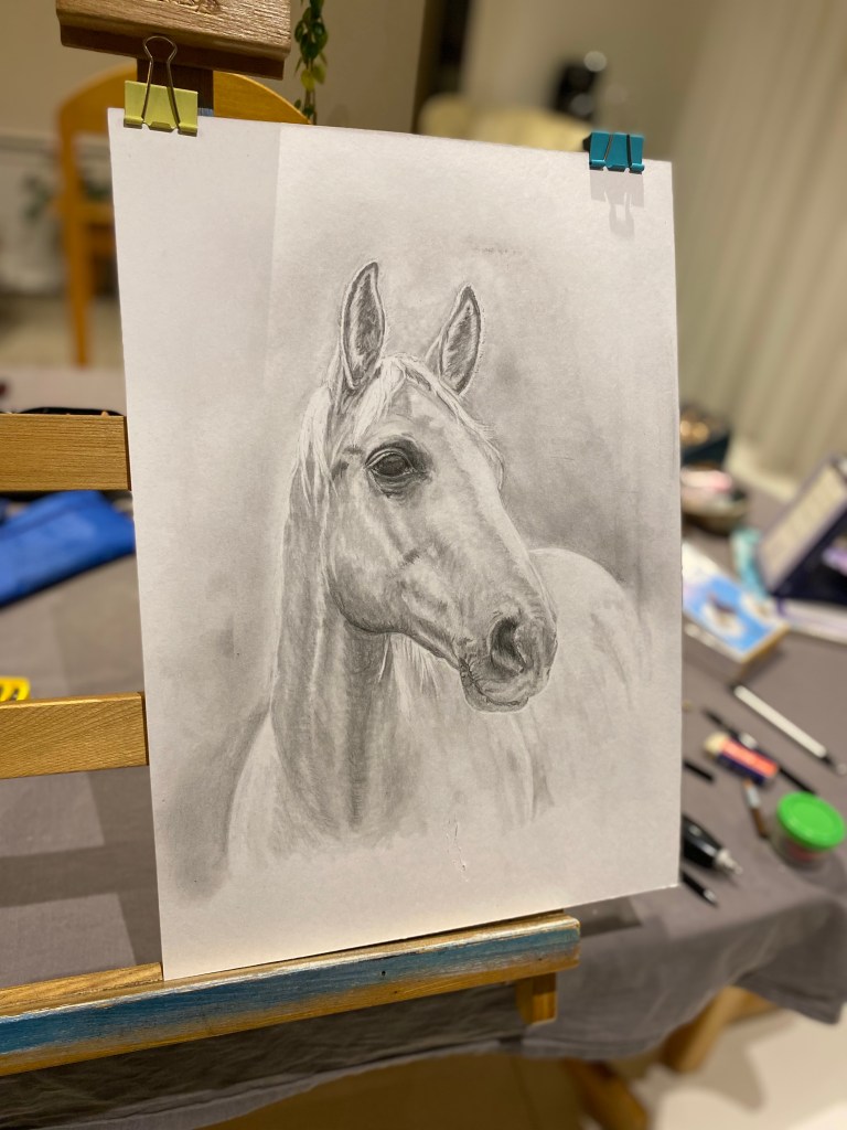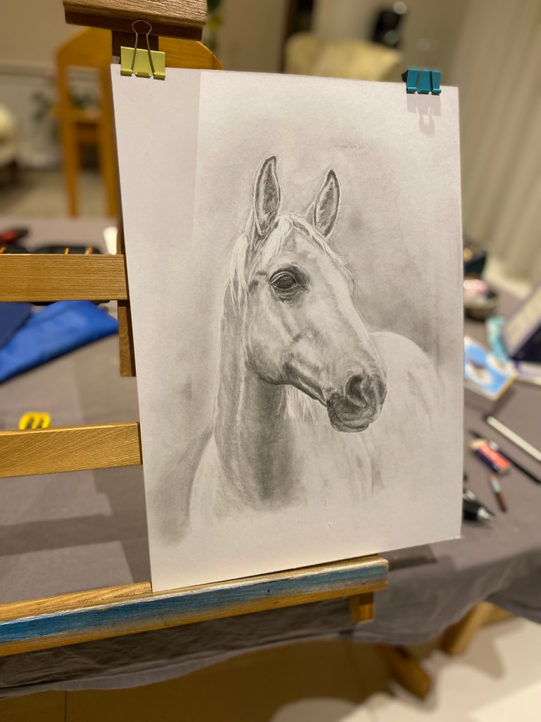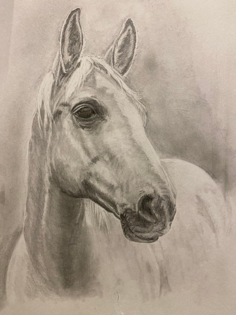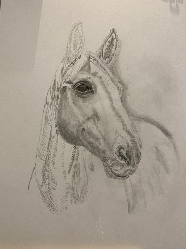 This drawing was taken from a photo of one of the beautiful Palomino horses we cared for during a house sit at Glen Tunnel in 2018.
