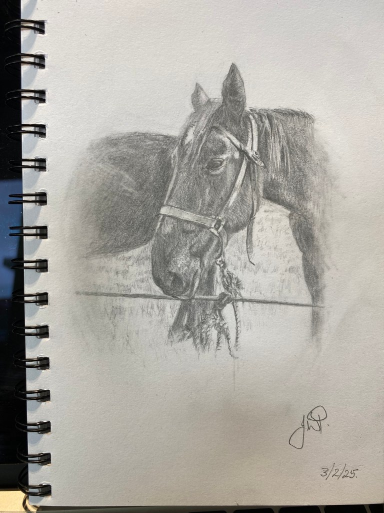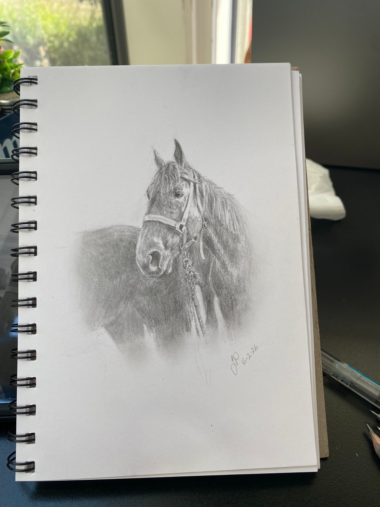 These two drawing are from scenes in a New Zealand doco-drama “Devils On Horses”. Patiently waiting in line, between scenes being shot on set at The Plains Vintage Railway Museum, Ashburton, these horses show incredible patience at all times – whether here or in a parade in the middle of a busy city.